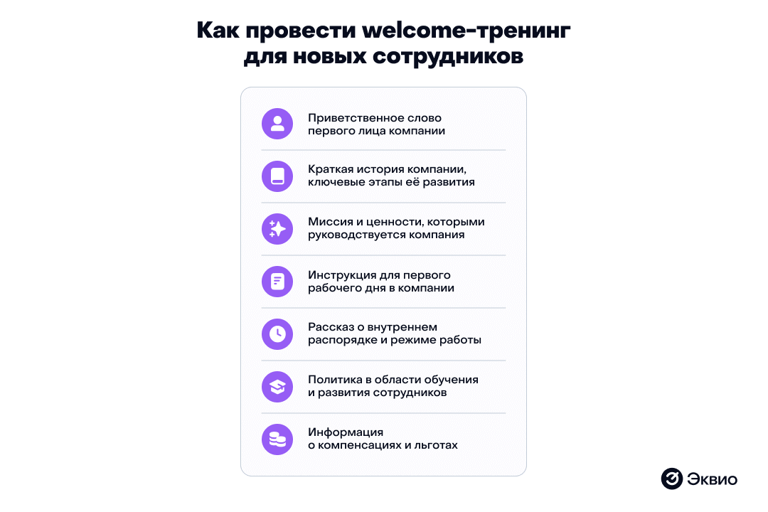 Чаще всего welcome-тренинг проводят на этапе онбординга. Новичку рассказывают об истории, продуктах и услугах, целях и планах компании, знакомят с корпоративной культурой и коллегами.