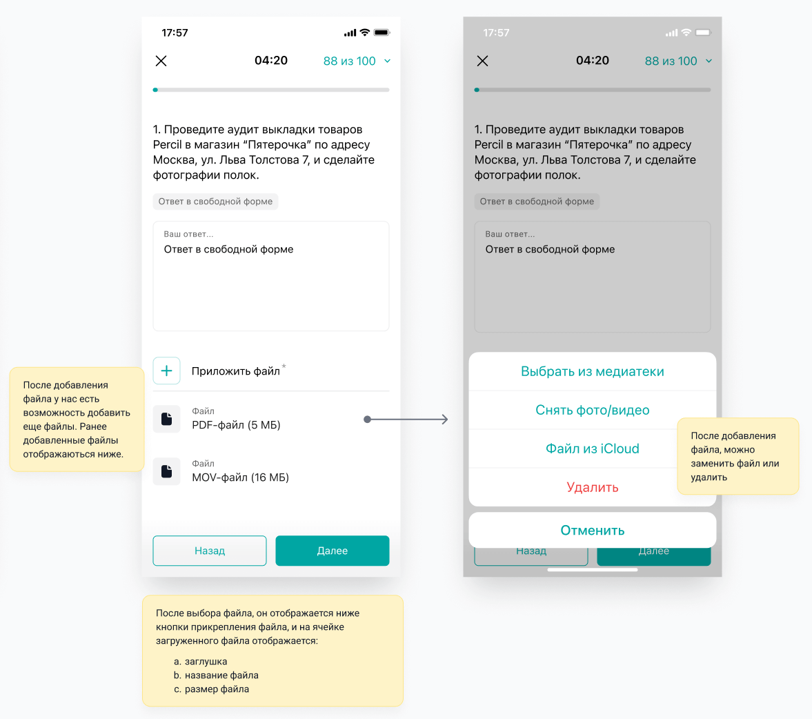 - Нажатие на прикрепленный файл открывает меню с возможностью заменить/удалить файл.