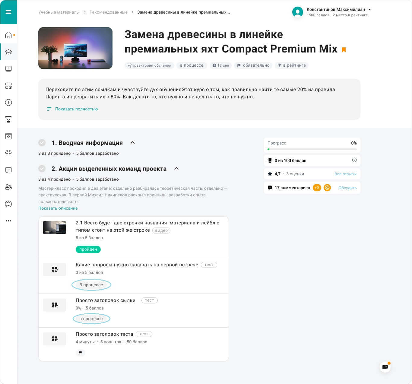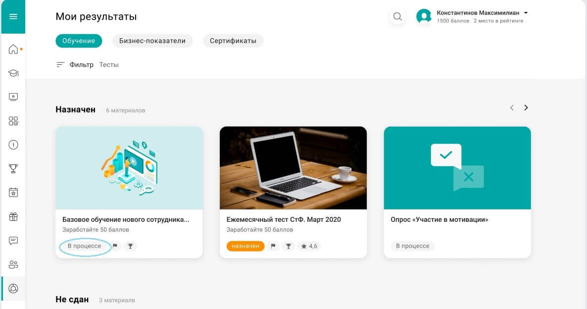 Для материалов типа “Тест”, помимо существующих статусов “сдан”/”не сдан”, появляется новый статус “В процессе”.