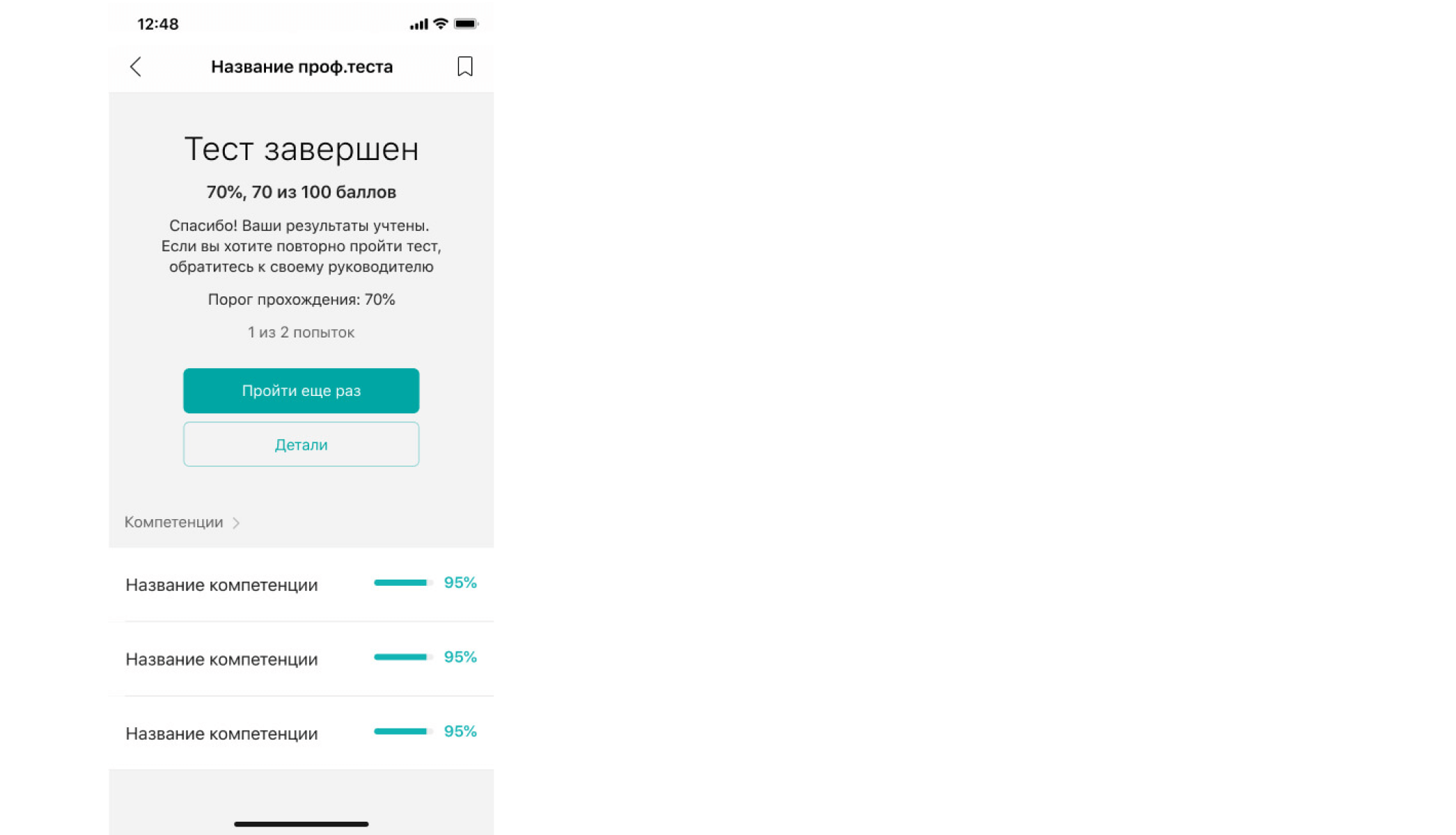 - Компетенции отсортированы по результату прохождения — от наибольшего процента к наименьшему.