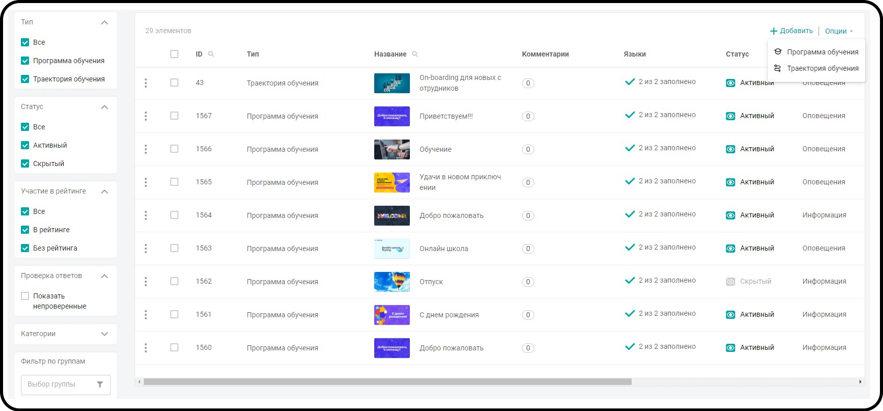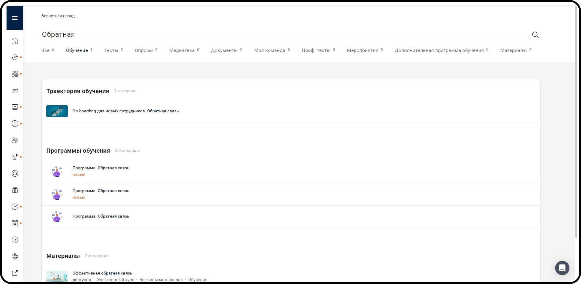 Список материалов в модуле «Обучение»