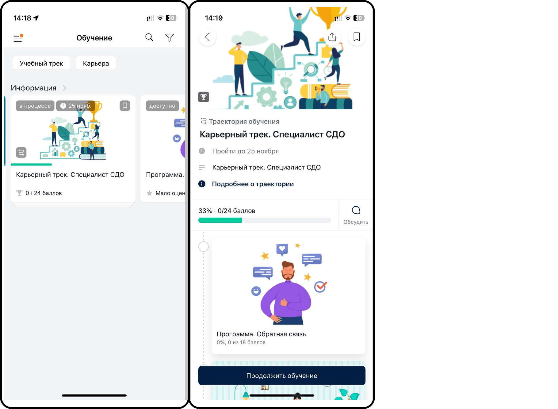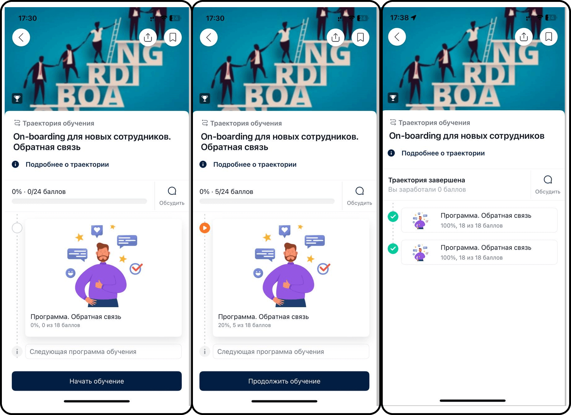 — если по траектории уже есть статистика, но она не завершена, то в нижней части экрана закреплена кнопка «Продолжить обучение», по клику на которую открывается текущая программа для прохождения,