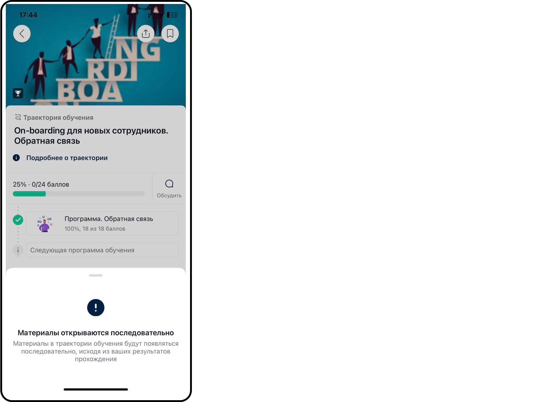 - Если траектория типа «последовательно» или «по дням», появляется подсказка «Материалы открываются последовательно» при клике на следующие элементы: