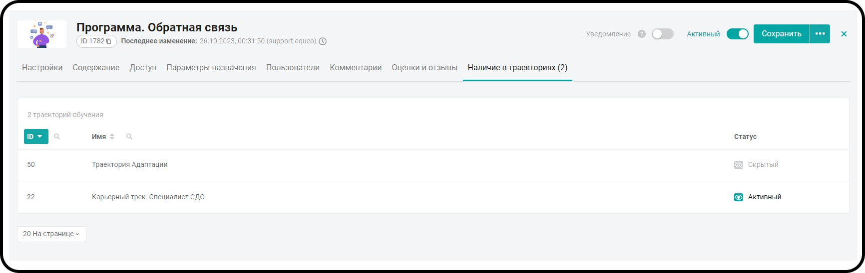 - Статистика в системе единая. Если программа обучения используется в нескольких траекториях, то её статистика будет отображаться во всех этих траекториях.