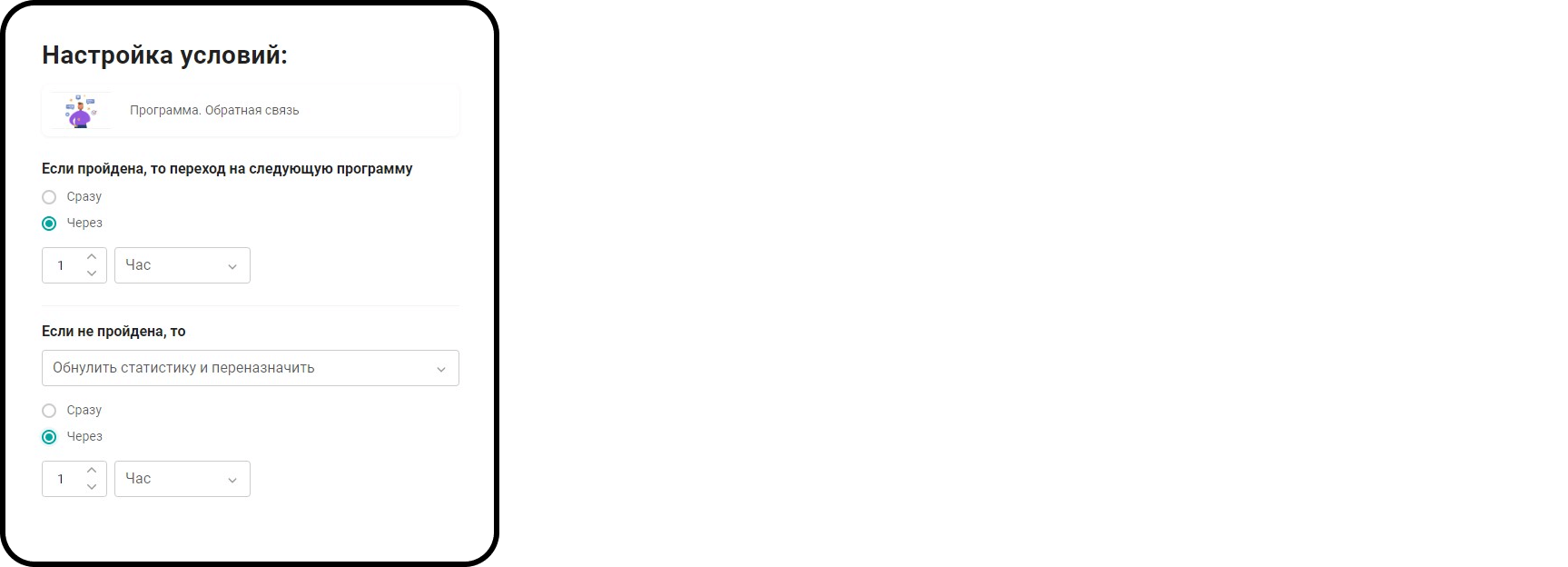 - Что должно происходить, если пользователь не прошёл программу. Возможные варианты: «Завершить траекторию (траектория провалена)», «Обнулить статистику и переназначить» Возможные варианты: «Сразу» и «Через».