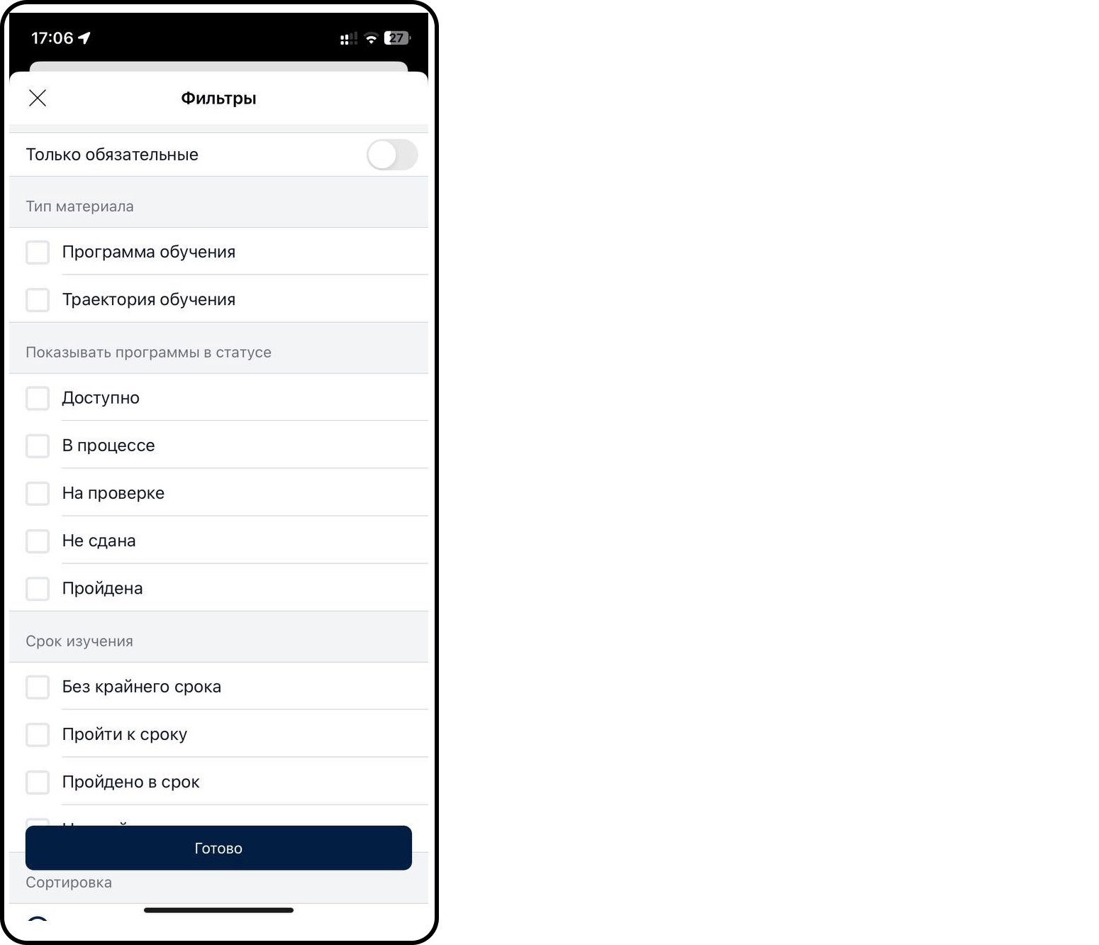 - Доступны следующие виды фильтрации: Теги, Обязательность, Тип материала, Статус, Срок изучения, Сортировка.