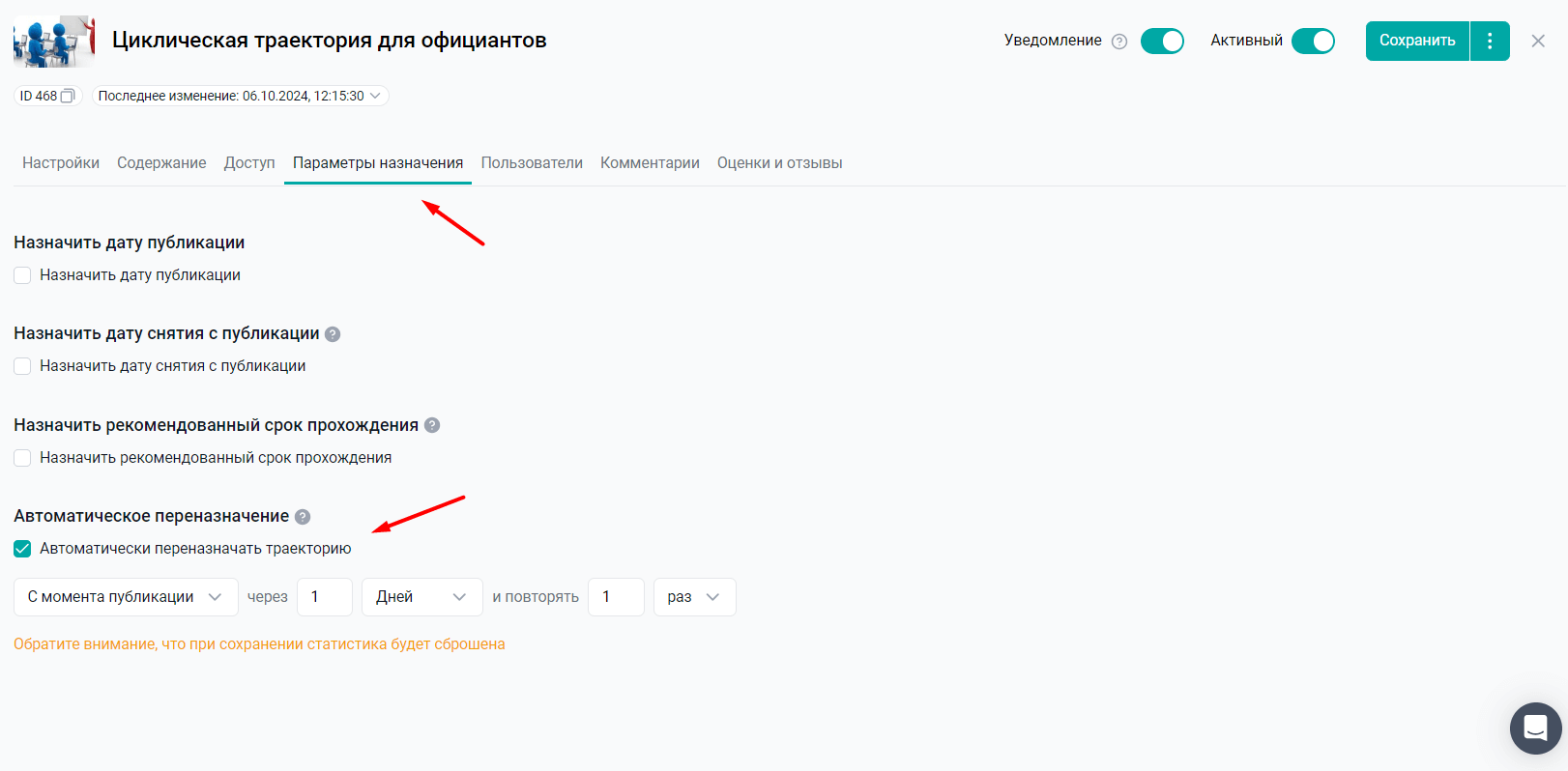 Перейти в раздел «Параметры назначения» (траектории обучения) и выставить настройки цикличного прохождения (автоматическое переназначение).