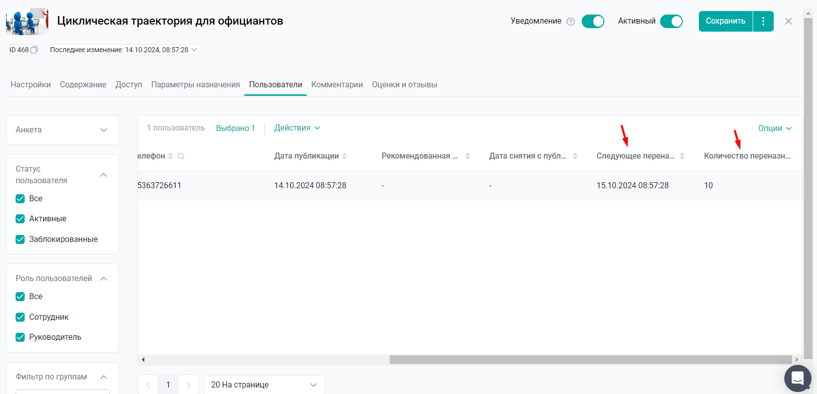 В настройках траекторий обучения/программ обучения во вкладке “Пользователи” теперь отображаются дополнительные блоки с информацией – “следующее переназначение” и “количество переназначений”.