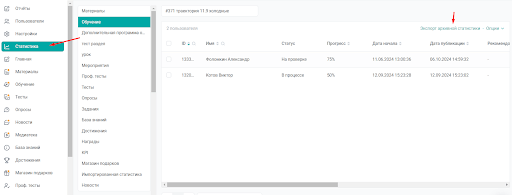 Перейти в раздел «Статистика», выбрать фильтр «По траектории» или «По нескольким траекториям» и указать необходимую траекторию обучения. Если в данной траектории содержится архивная статистика(устаревшая), тогда будет отображаться кнопка “Экспорт архивной статистики” для выгрузки этой информации в файл Excel. В выгруженном файле будет находится “текущая” и “архивная” статистика.