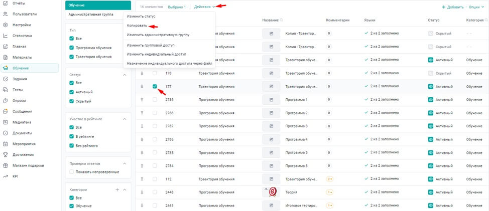 - Что нужно делать: в разделе обучение выбрать траектории, которые вы хотите копировать, нажать Действия — Копировать — Указать раздел, в который требуется скопировать. Также можно копировать доступ к траектории или затем настроить его вручную.
