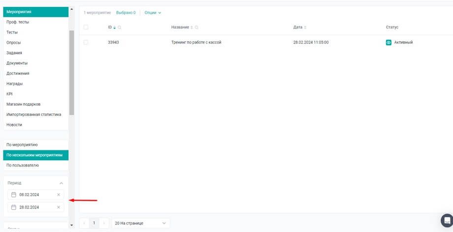 - Что нужно делать: зайти в раздел Статистика, перейти в Мероприятия, выбрать фильтр По нескольким мероприятиям и выбрать дату начала и окончания проведения мероприятия.