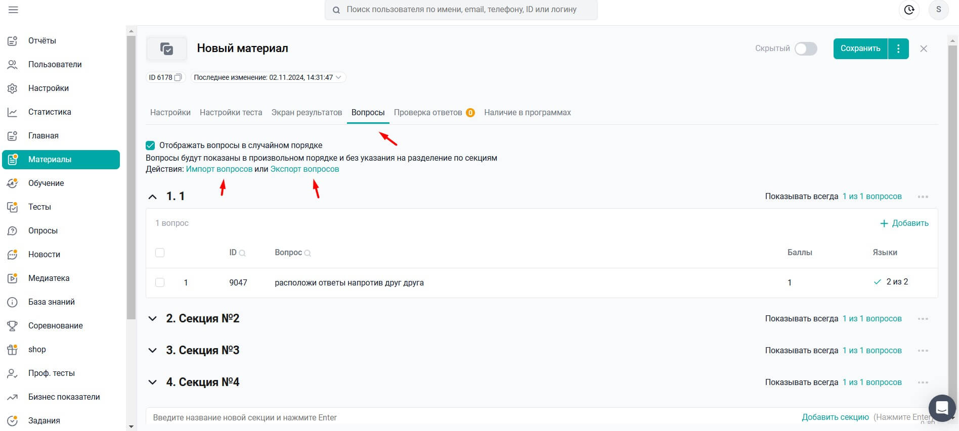 Перейти в материал «Тест» и воспользоваться кнопкой «Импорт вопросов для загрузки новых вопросов в тест», а также можно использовать кнопку «Экспорт вопросов» для выгрузки с платформы уже созданных вопросов.
