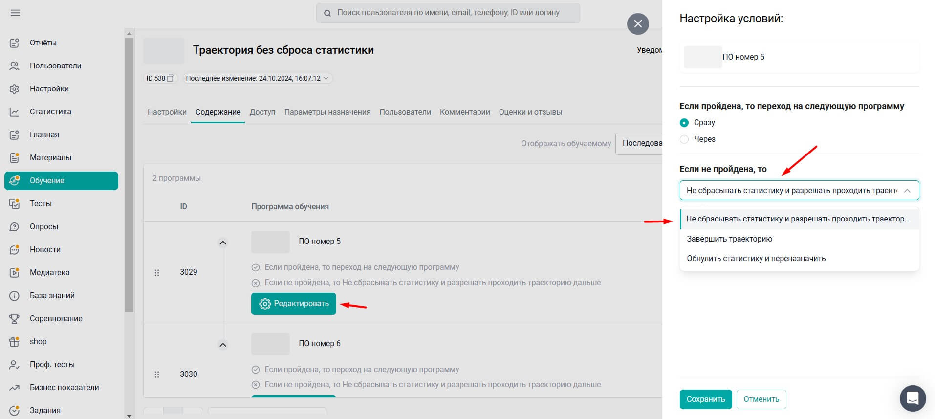 Перейти в «Содержание»» траектории обучения, выбрать программу обучения и в настройке «Если не пройдена, то» указать новое условие — «Не сбрасывать статистику и разрешать проходить траекторию дальше».
