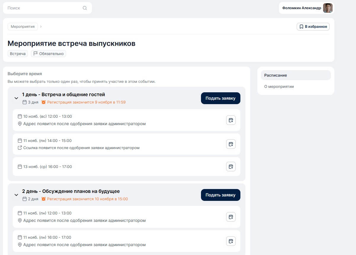Теперь раздел мероприятия — это удобный конструктор событий, в котором можно легко и гибко планировать мероприятия с учётом различных потребностей. Вы можете создать нужное количество сессий, каждая из которых может включать как однодневные, так и многодневные события.